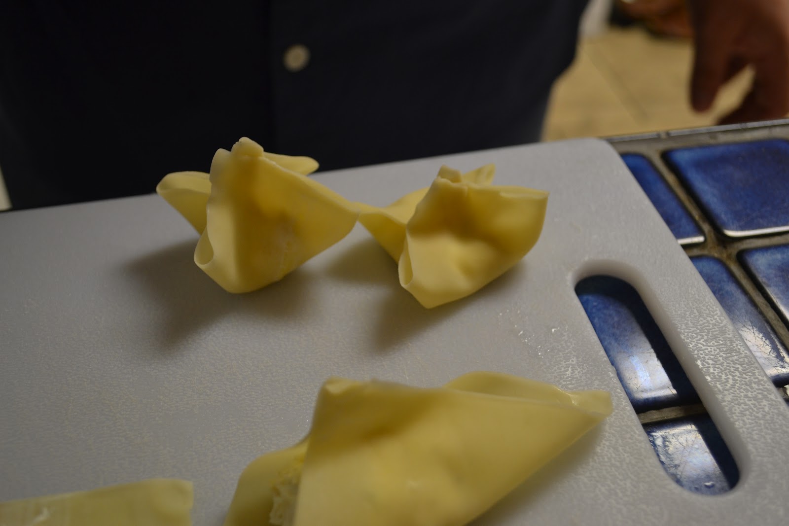 Lay your won ton wrappers out on the cutting board & place about 1 tbs of crab mix into the center of the won ton. Then dip a finger into the water to wet all the sides of the wrappers. Then bring the corners of the wrappers in the middle above the crab mixture. Check out my hubby above if you need some help with this step.